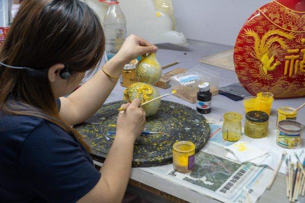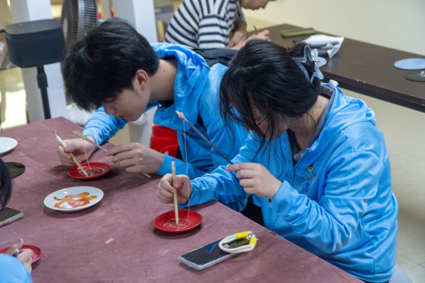 三下鄉(xiāng)隊(duì)伍駐足漆線雕傳承工作室,推開工作室的門,便置身于大漆與歲月交織的藝術(shù)空間。漆線雕作為閩南傳統(tǒng)工藝,將天然大漆與陳年磚粉經(jīng)反復(fù)舂搗調(diào)和,制成柔韌的 “漆線土”。匠人憑借嫻熟技法,在素白瓷坯上盤繞出纏枝蓮紋、祥云朵朵等立體紋樣,再施以金箔、彩料裝飾,最終呈現(xiàn)出精美的漆線雕作品。其色彩與紋樣承載著閩南地區(qū)的民俗信仰與生活風(fēng)情,是地域文化的生動(dòng)寫照。成員們親手嘗試盤制簡(jiǎn)單圖案,通過指尖觸感,切實(shí)體會(huì)到這門千年技藝的深厚底蘊(yùn)與獨(dú)特魅力。