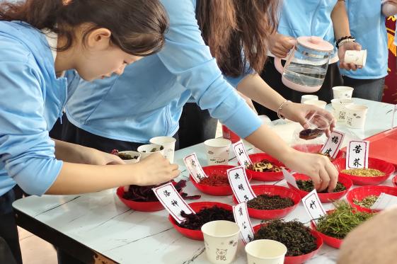 社區(qū)活動室內(nèi),陣陣花草香悄然彌漫。實踐團成員們提前備好枸杞、洛神花、玫瑰、決明子等應季花草食材,細心清洗、分類分裝。當老人們陸續(xù)入座,年輕的身影在茶桌間穿梭忙碌:溫水潤杯、投茶注水,動作雖略顯生澀,卻透著十足的認真。