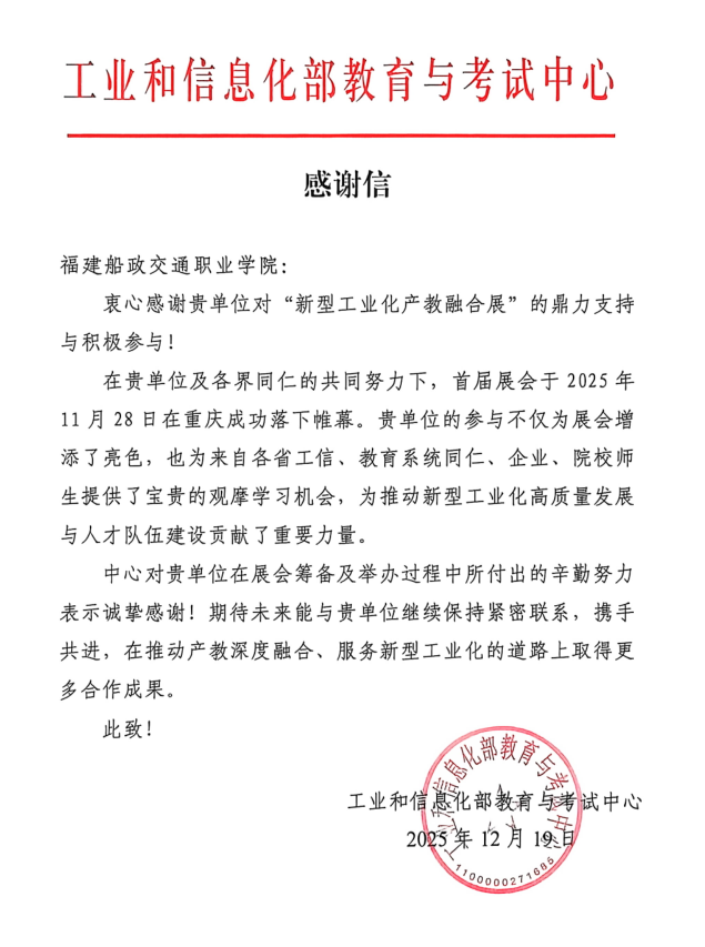 2025年11月28日,首屆"新型工業(yè)化產(chǎn)教融合展"在重慶成功舉辦。我院受邀參展,為各省工信、教育系統(tǒng)同仁、企業(yè)及院校師生提供了寶貴的學(xué)習(xí)交流平臺。近日(12月19日),工業(yè)和信息化部教育與考試中心向我校發(fā)來感謝信,肯定我校對推動新型工業(yè)化高質(zhì)量發(fā)展與人才隊(duì)伍建設(shè)所作貢獻(xiàn),并期待未來繼續(xù)深化產(chǎn)教融合合作。