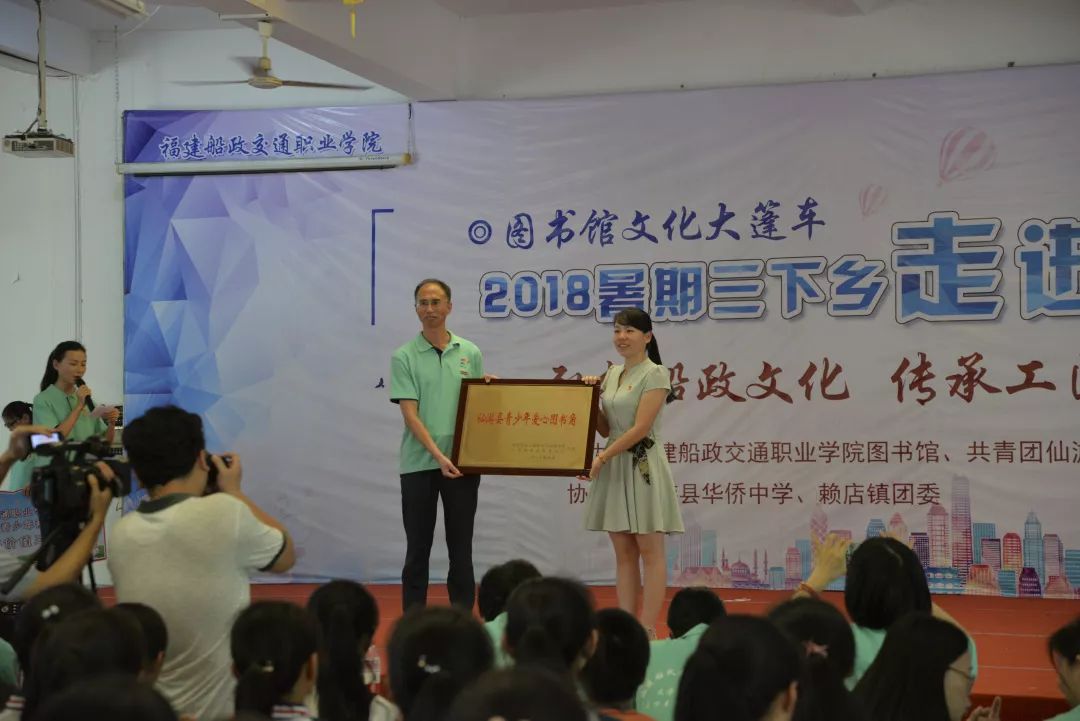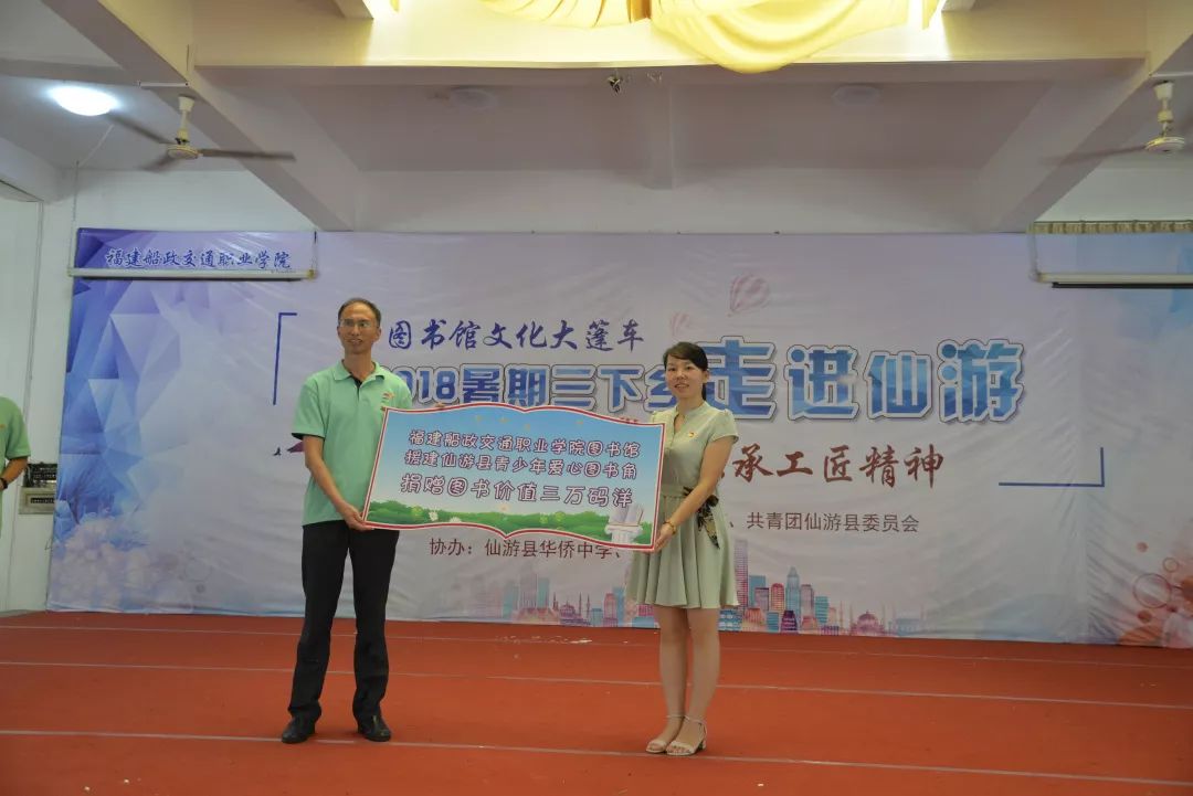 活動當天,福建船政交通職業(yè)學院圖書館陳家越館長現(xiàn)場為援建的仙游團縣委青少年愛心圖書角授牌,仙游團縣委書記陳麗君代表團縣委接受了愛心圖書角牌匾,并捐贈價值三萬元新書及愛心漂流圖書。