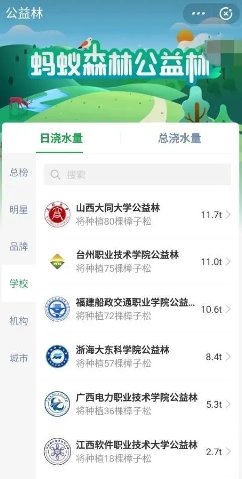 2.打開支付寶app,點擊螞蟻森林進入公益林板塊,搜索“福建船政交通職業(yè)學院公益林”