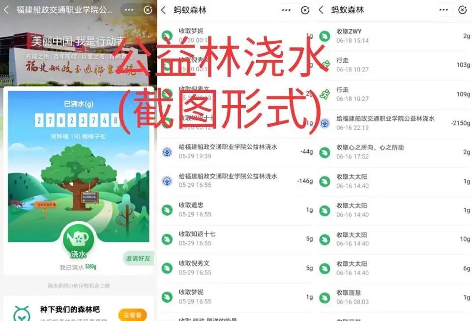 登錄三全育人平臺搜索“船政公益林澆水7/8/9月活動”活動,點擊“立即報名”,選擇報名信息“個人”后,上傳在7/8/9月為每個月學校公益林澆水量不少于5000g的截圖即可獲得三全育人“校園活動”模塊1積分哦,10000g可獲得2積分以此類推,每人兌換上限為10積分。大家在標題需要備注:學院班級姓名學號,截圖需要截到日期噢~