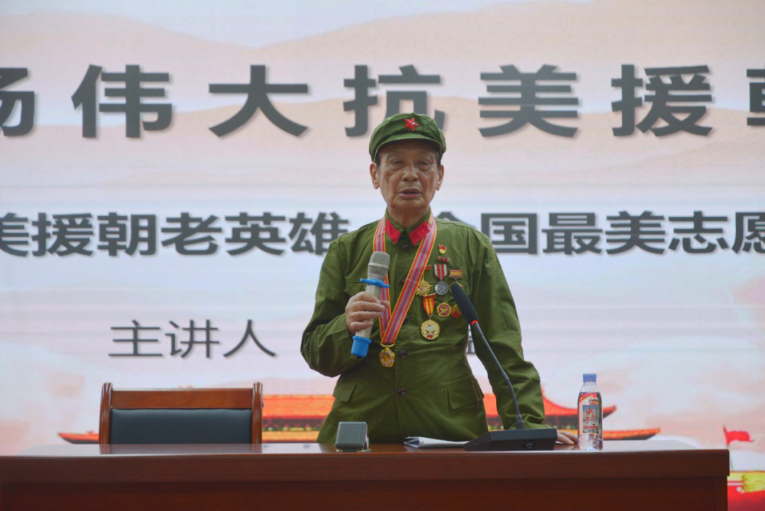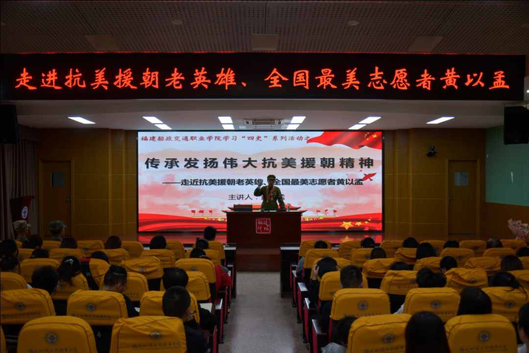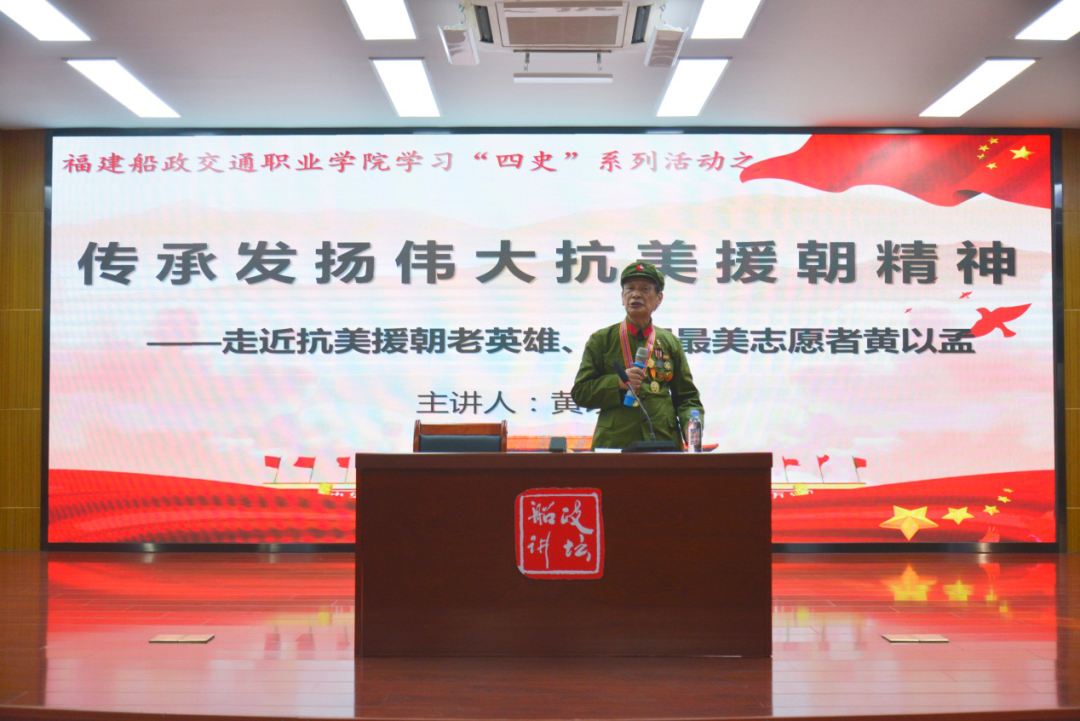 歷史是最好的“教科書(shū)”“營(yíng)養(yǎng)劑”和“清醒劑”?!八氖贰睂W(xué)習(xí)教育是引領(lǐng)青年學(xué)生堅(jiān)定理想信念、矢志拼搏奮斗、砥礪奮進(jìn)社會(huì)主義現(xiàn)代化國(guó)家建設(shè)新征程的信仰之源和力量之泉。值此抗美援朝戰(zhàn)爭(zhēng)勝利70周年之際,11月3日下午,我校邀請(qǐng)抗美援朝老英雄、全國(guó)最美志愿者、89歲高齡的黃以孟老先生蒞臨學(xué)校開(kāi)展《傳承發(fā)揚(yáng)偉大抗美援朝精神》專題報(bào)告會(huì)。