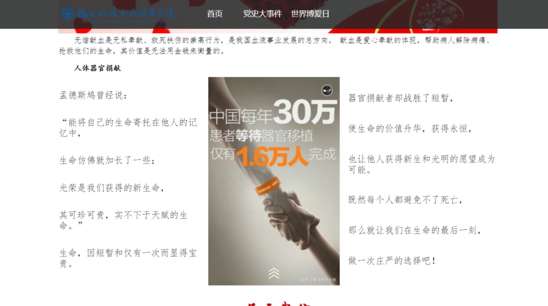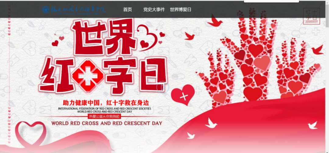 通過對(duì)黨史的學(xué)習(xí),我們更好的了解過去,以革命先輩的崇高精神為追求,我校紅十字會(huì)學(xué)生分會(huì)于5月1日-10日開展“學(xué)史崇德,博愛載物”網(wǎng)頁設(shè)計(jì)比賽,本次活動(dòng)共收到船政學(xué)子投稿作品40份。有力推動(dòng)學(xué)習(xí)黨史氛圍,在踐行社會(huì)主義核心價(jià)值觀中,弘揚(yáng)“人道、博愛、奉獻(xiàn)”的紅十字精神。