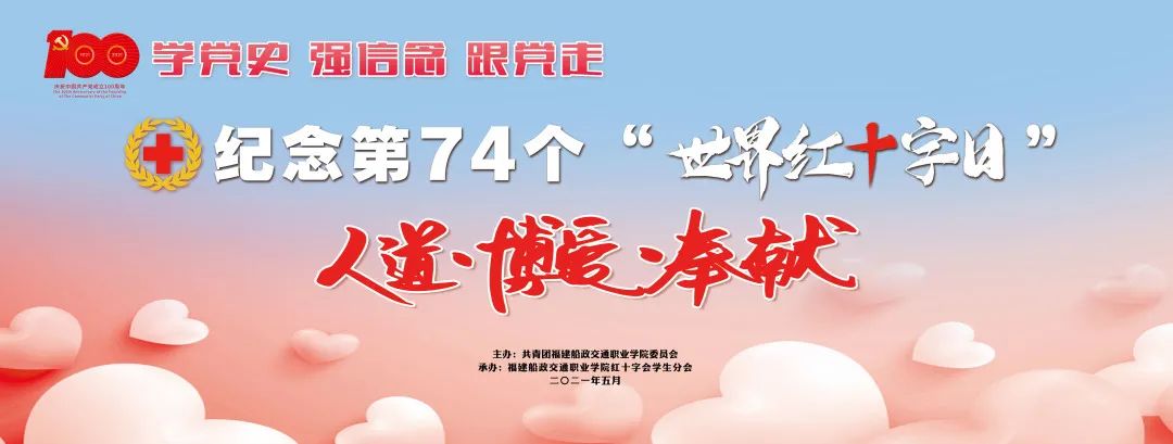 2021年5月8日是第74個(gè)“世界紅十字日”,為推動(dòng)黨史學(xué)習(xí)教育深入開展,大力營造良好輿論環(huán)境,動(dòng)員更多社會(huì)力量參與和支持紅十字事業(yè),以優(yōu)異成績(jī)慶祝中國共產(chǎn)黨成立100周年,提高全校師生社會(huì)責(zé)任感和使命感,營造健康良好的校園生活環(huán)境,福建船政交通職業(yè)學(xué)院紅十字會(huì)學(xué)生分會(huì)在學(xué)校黨委領(lǐng)導(dǎo)和團(tuán)委指導(dǎo)下,組織開展2021年第74個(gè)“世界紅十字日”主題系列活動(dòng)。此次活動(dòng)包括線上知識(shí)答題、志愿者培訓(xùn)、紅十字日校園活動(dòng)、青春健康教育學(xué)習(xí)培訓(xùn)會(huì)、女性健康知識(shí)講座、防震減災(zāi)逃生演練、海報(bào)設(shè)計(jì)、急救知識(shí)進(jìn)社區(qū)、暖心抒寫送祝福、網(wǎng)頁設(shè)計(jì)比賽、鴻儒養(yǎng)老樂園志愿服務(wù)等十二項(xiàng)活動(dòng)。