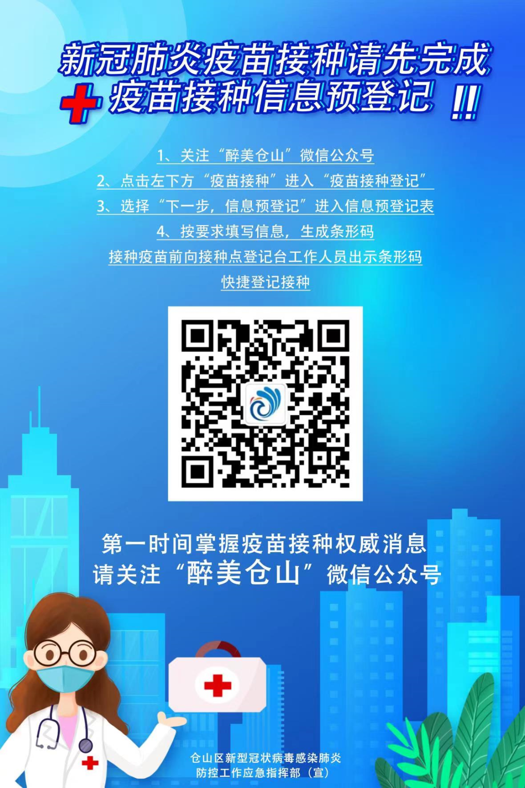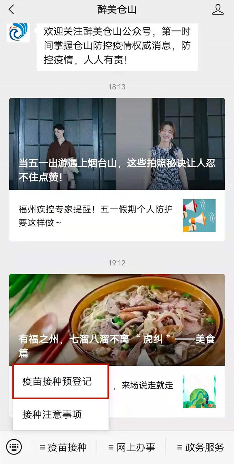 關(guān)注并進(jìn)入“醉美倉山”公眾號(hào)后,點(diǎn)擊下方“疫苗接種”按鈕,再點(diǎn)擊“疫苗接種預(yù)登記”。