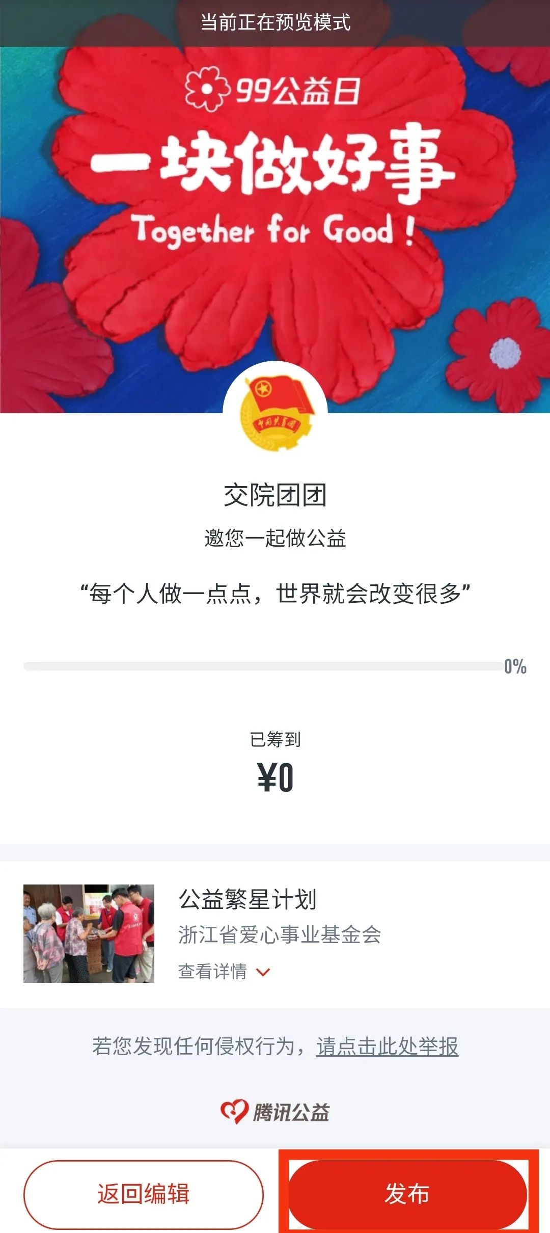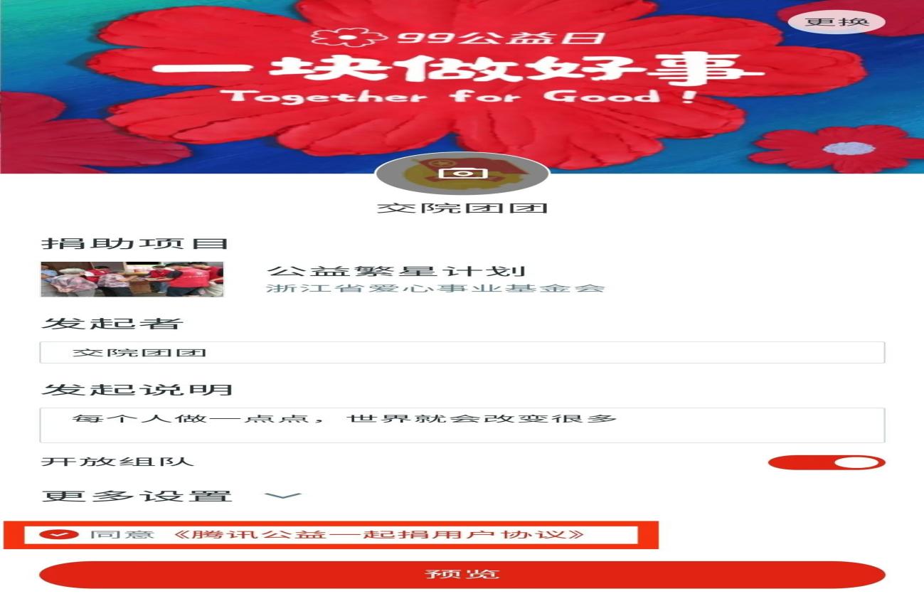 第二步,填寫發(fā)起人、發(fā)起說明等信息,勾選《騰訊公益一起捐用戶協(xié)議》后,進入預覽界面。