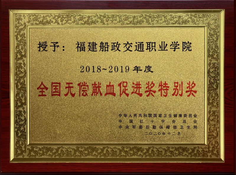 授予福建船政交通職業(yè)學院2018-2019年度全國無償獻血促進獎