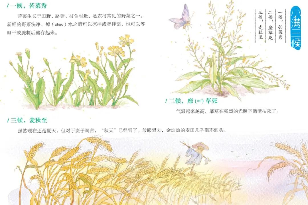 小滿節(jié)氣后,苦菜已經(jīng)枝葉繁茂;之后,喜陰的一些枝條細(xì)軟的草類在強(qiáng)烈的陽光下開始枯死;在小滿的最后一個(gè)時(shí)段,麥子開始成熟。雖然時(shí)間還是夏季,但對(duì)麥子來說,卻到了成熟的“秋”。