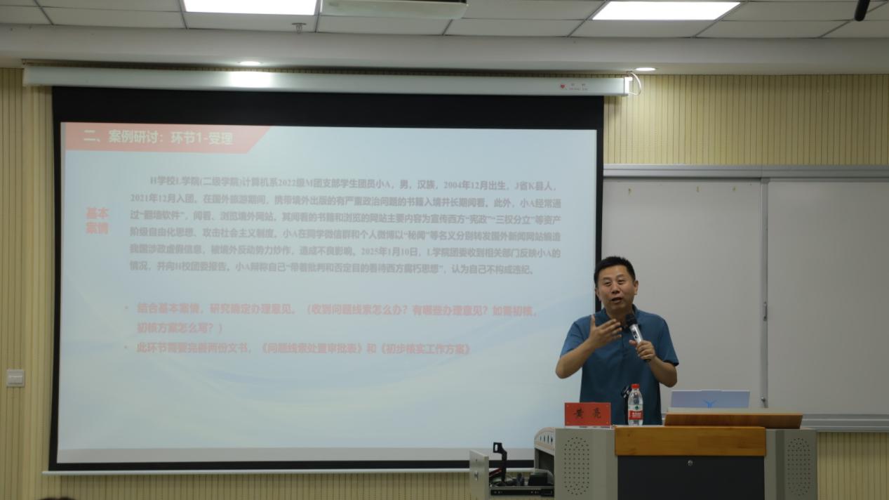 最后一講,是中央團(tuán)校黃亮老師帶來的《團(tuán)紀(jì)執(zhí)行案例教學(xué)》。課程通過聚焦團(tuán)紀(jì)執(zhí)行核心,明確縣級及以上團(tuán)的委員會組織部門等執(zhí)紀(jì)權(quán)限,詳解從受理到處分執(zhí)行的5個關(guān)鍵步驟,全程強(qiáng)調(diào)集體研究的重要性;并通過現(xiàn)場模擬案例,切實(shí)提升教師團(tuán)干依規(guī)執(zhí)紀(jì)能力,為團(tuán)務(wù)工作開展和青年學(xué)生行為規(guī)范提供清晰遵循。