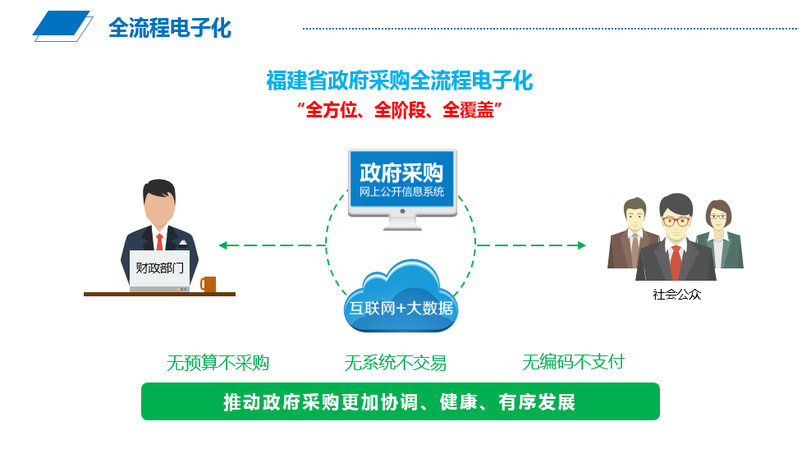 福建省政府采購網(wǎng)上公開信息系統(tǒng)2017年3月1日在省級正式上線,經(jīng)過6個月運行,全流程網(wǎng)上公開運行平穩(wěn),政府采購流程電子化實現(xiàn)“全方位、全階段、全覆蓋”,全程電子化監(jiān)管閉合鏈條形成。