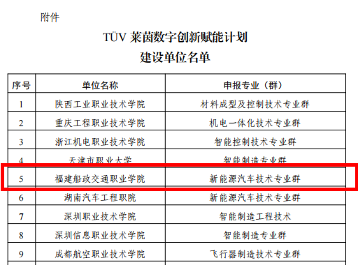 2023年3月14日,中國教育國際交流協(xié)會(huì)公布了“TüV萊茵數(shù)字創(chuàng)新賦能計(jì)劃”建設(shè)單位名單。我校成為建設(shè)單位之一,新能源技術(shù)專業(yè)群被確立為建設(shè)專業(yè),在獲批名單內(nèi)排名第五。