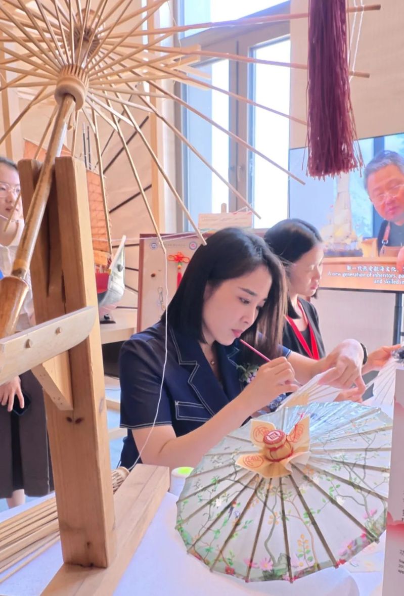 在本次職業(yè)教育國際盛會上,我院展位以“千帆共傘 大道同行”為主題?!扒Х痹醋愿=ù煌殬I(yè)學(xué)院根植的百年船政文化,象征著揚(yáng)帆遠(yuǎn)航、開拓進(jìn)取的船政精神;而“共傘”則承載著福州先民賦予福州油紙傘“為遠(yuǎn)行者遮風(fēng)擋雨、傳遞平安祝?!钡墓爬显⒁狻烧呓Y(jié)合,寓意著承載船政精神的福建船政交通職業(yè)學(xué)院,愿與世界各國友人攜手并肩,共同守護(hù)人類文化遺產(chǎn),為遠(yuǎn)行的全球伙伴撐起一片合作共贏、心意相通的天空。師生們與非遺傳承人一道,現(xiàn)場展示了福州油紙傘精湛繁復(fù)的制作技藝及其蘊(yùn)含的深厚東方智慧。一件件融合了傳統(tǒng)匠心與現(xiàn)代審美的油紙傘作品,以其獨(dú)特的藝術(shù)魅力和美好寓意,深深吸引了與會歐洲多國領(lǐng)導(dǎo)人、各職業(yè)教育協(xié)會負(fù)責(zé)人及國際友人的目光,紛紛駐足了解和體驗。